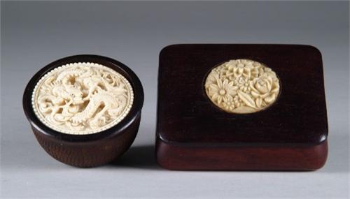 TWO WOOD AND IVORY COVERED BOXES. Lot includes a 1-1/4in. h x 3-1/4in. w x 4in. rectangular box with carved ivory round insert to cover having well carved flower bouquet. Box marked "Made in Japan". Appears to be mahogany. The other is a 1-1/2in. h x 2-3/4in. dia round basket decorated mahogany box with carved ivory round lid decorated with serpent. CONDITION: Both are very good. 9-25465