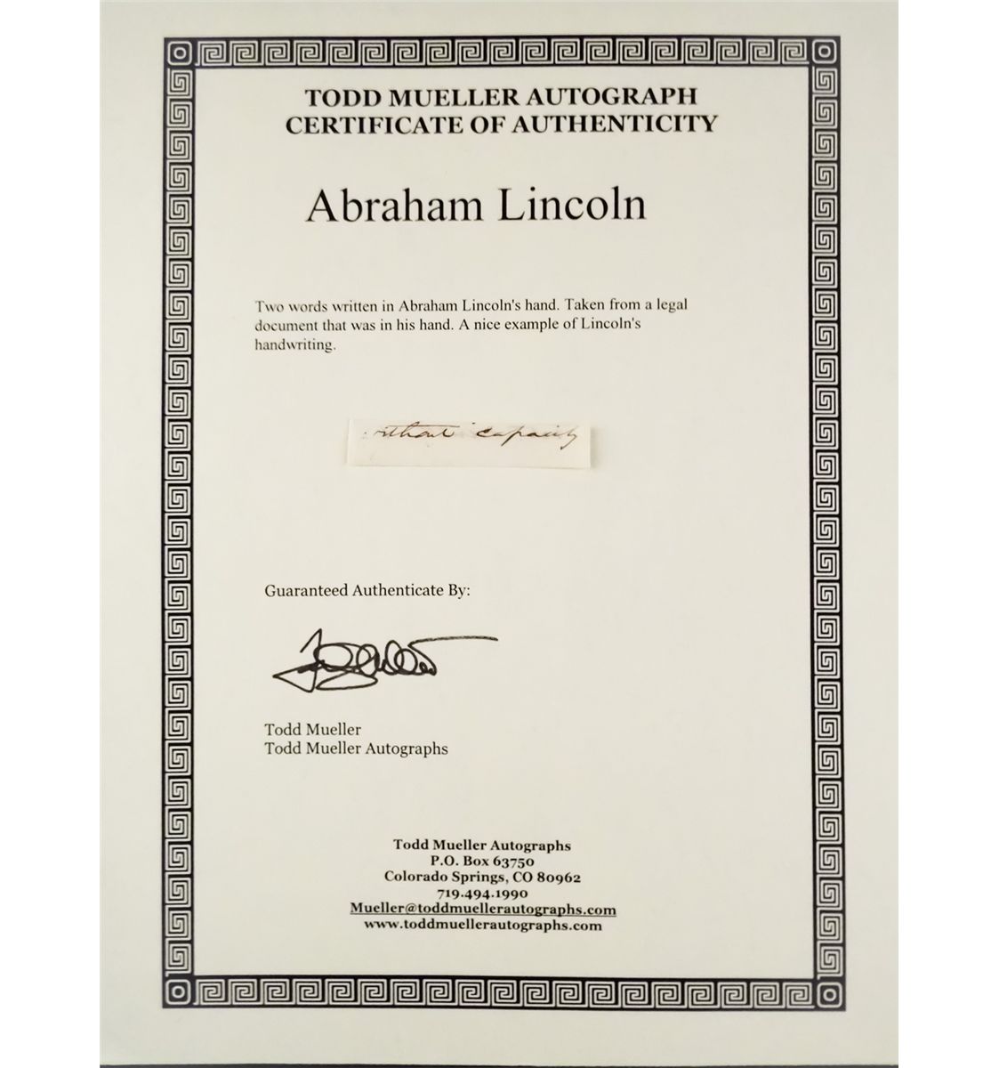 TWO WORDS WRITTEN IN THE HAND OF ABRAHAM LINCOLN. CUT FROM A LARGER DOCUMENT. INCLUDES PROVENANCE PAPERWORK.