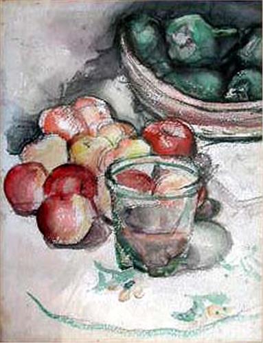 TWO WORKS OF ART; Comprising a mixed media still life of a flower-filled vase with single-light dog-form candlestick, signed LR, Paul Thereney, dated 1921, the second a watercolor still life of fruit. Each with foxing and staining From 10 1/2"h x 8"w to
