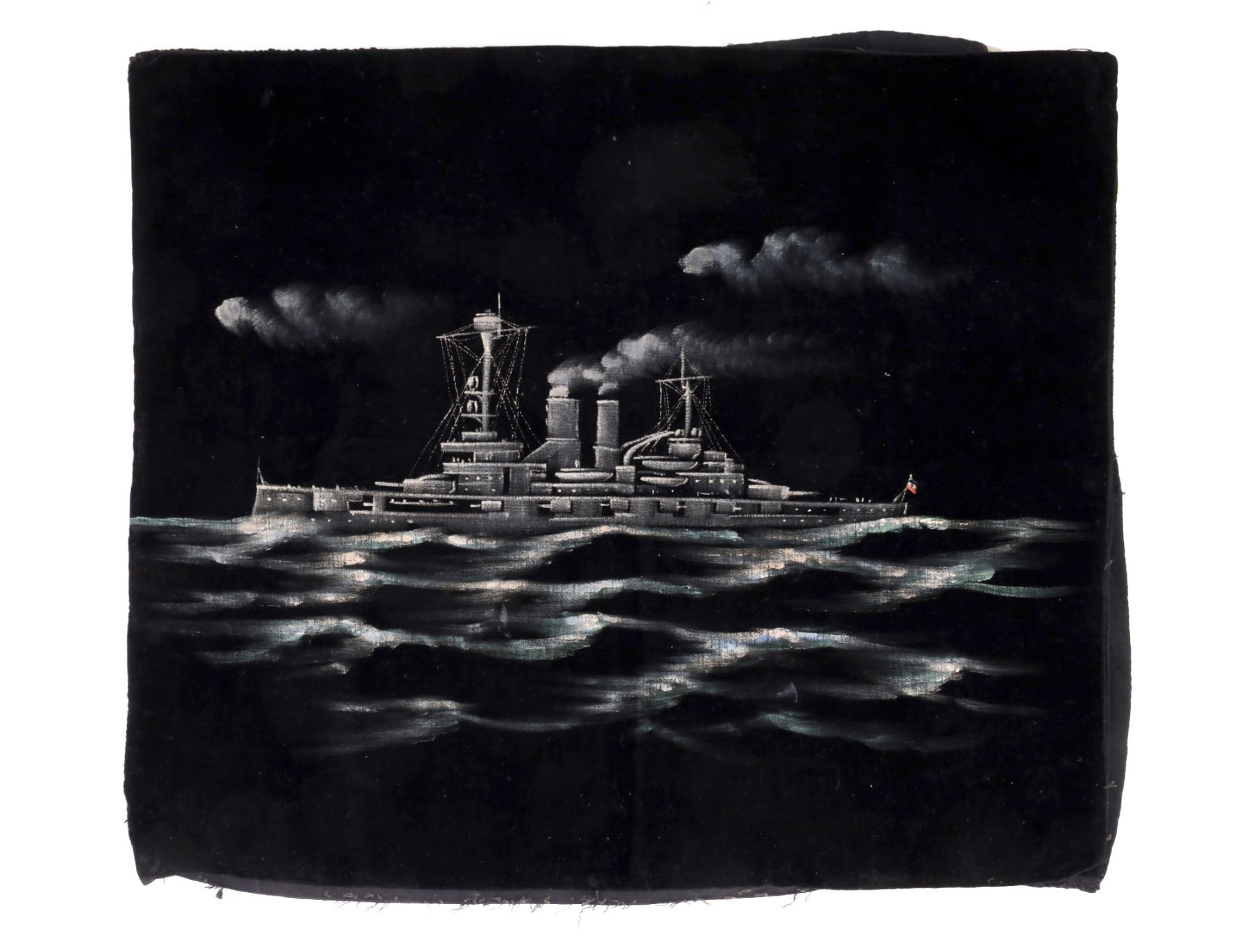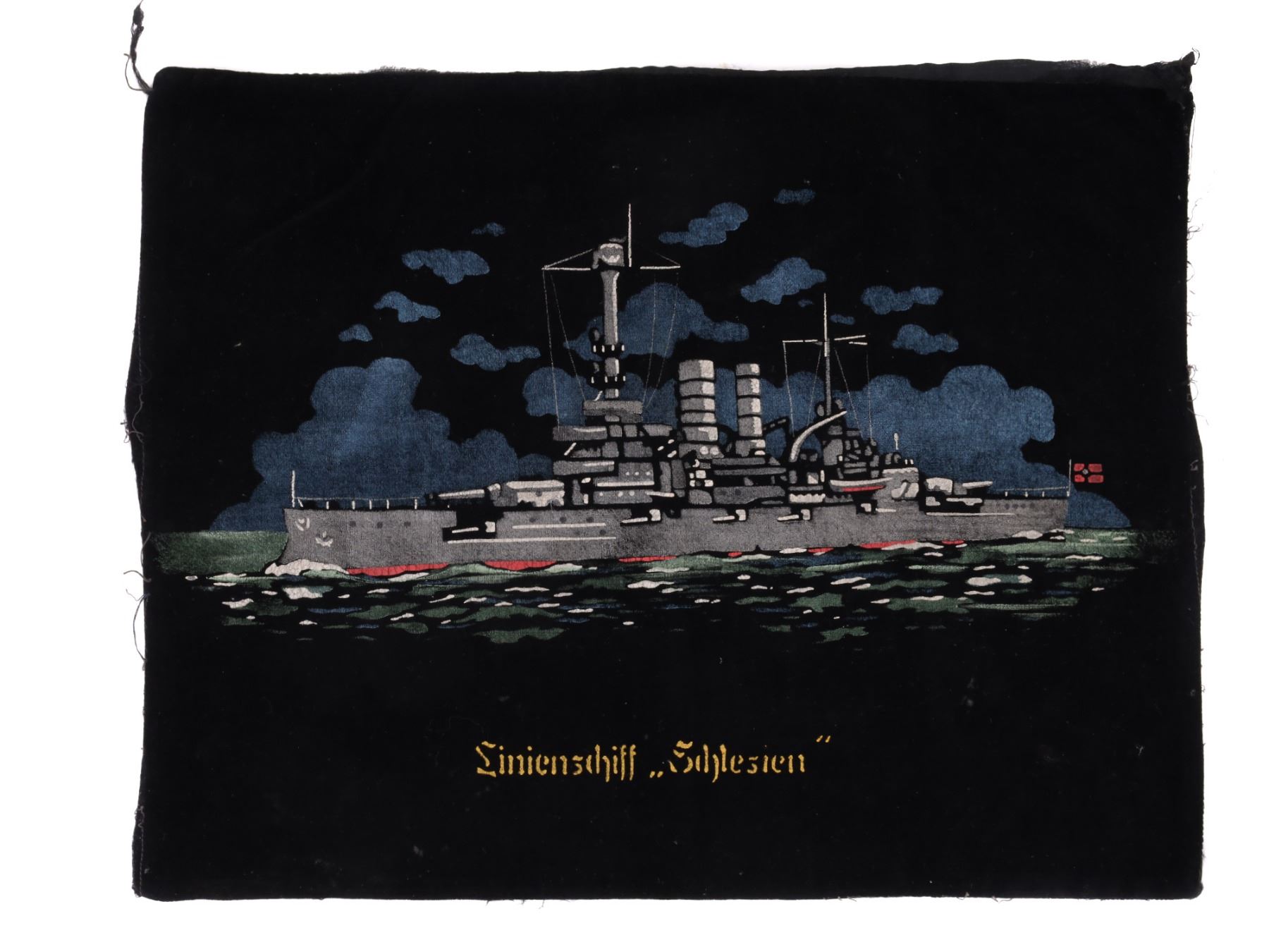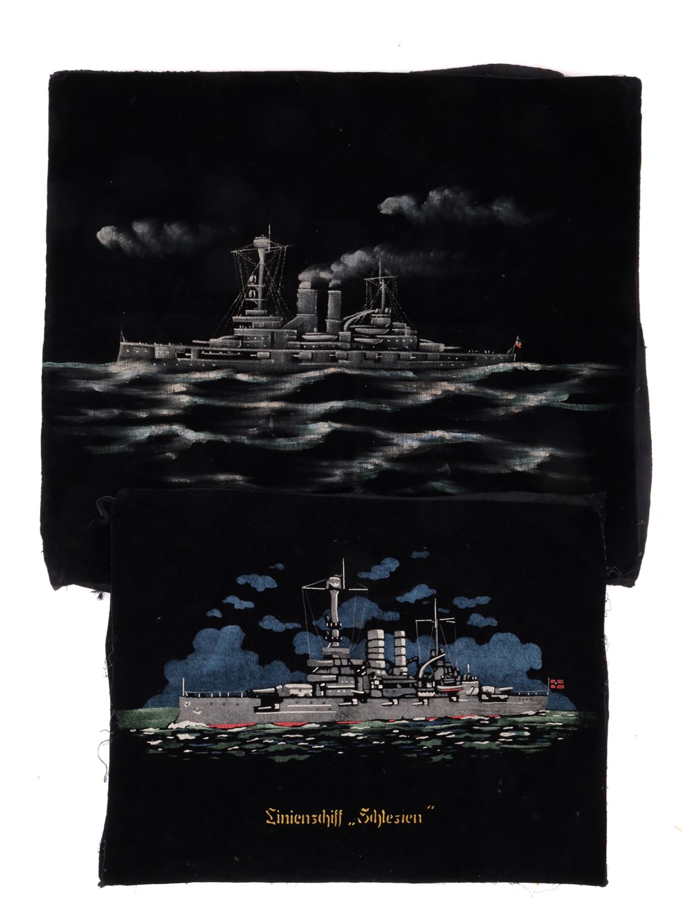Two Imperial German flags. One depicts Linienschiff Schlesien.