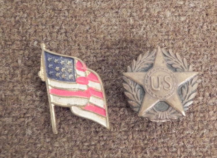 TWO WWI PATRIOTIC PINS-US IN STAR & FLAG STAR & WREATH WITH US IS A BUTTON HOLE PIN--FLAG IS PINBACK