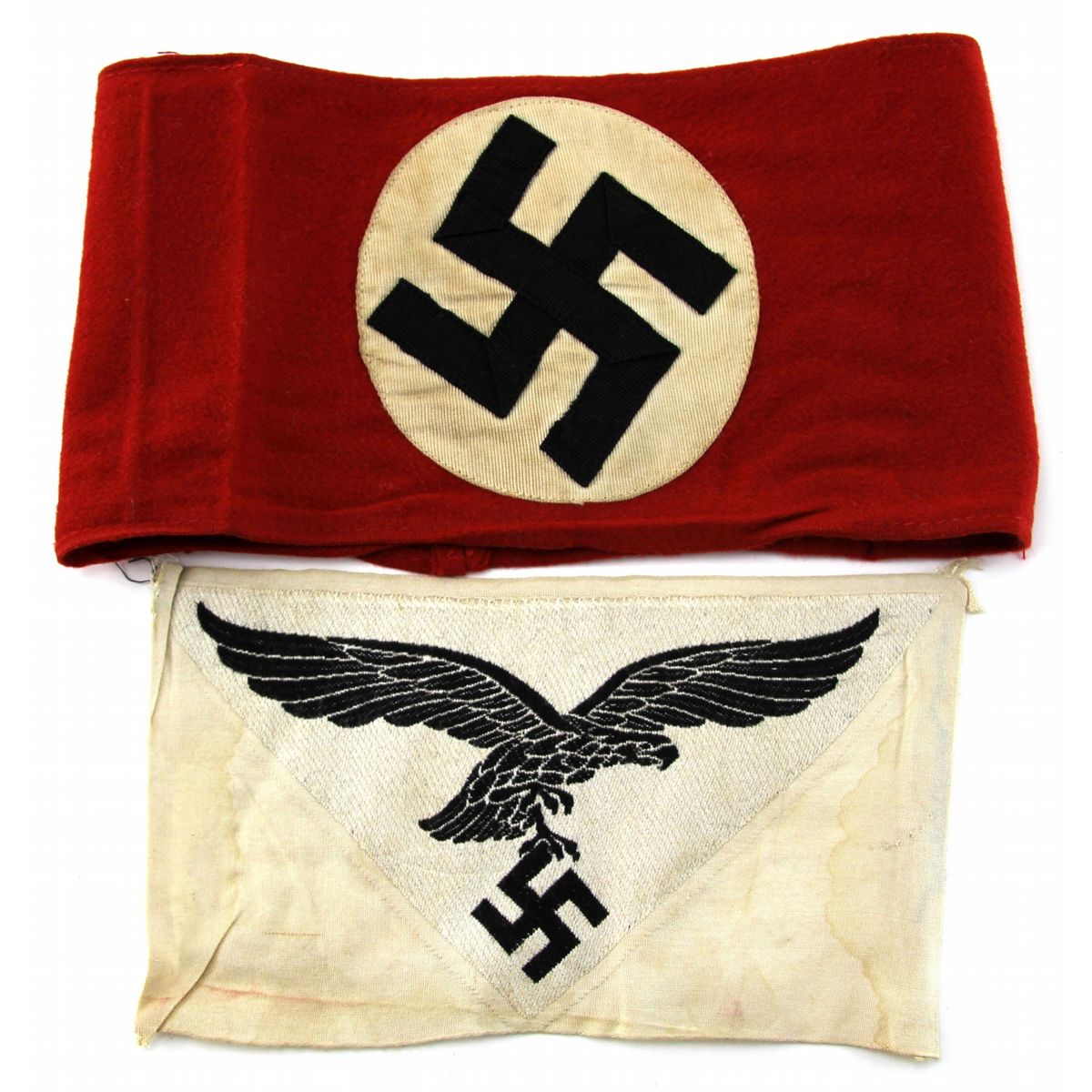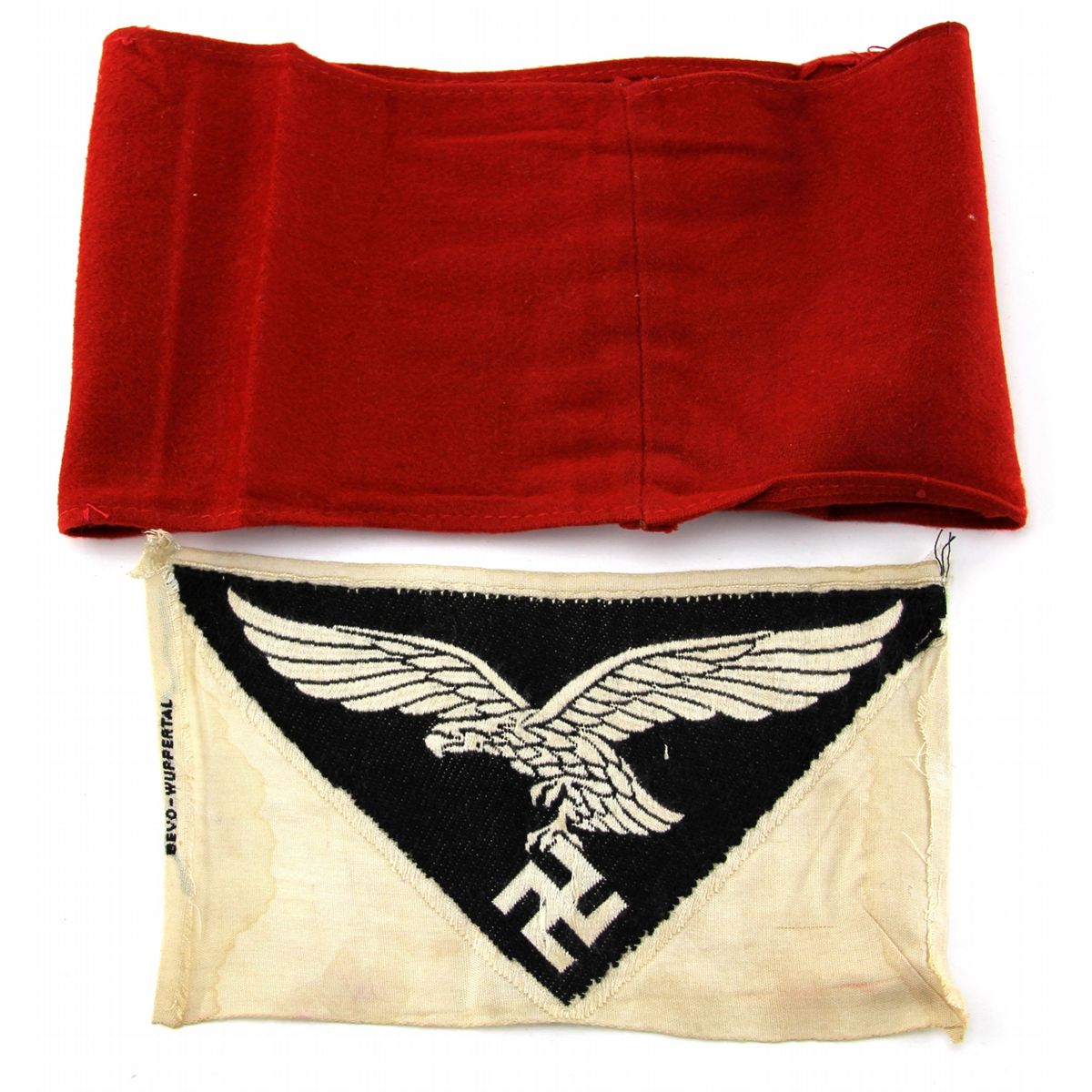 TWO WWII GERMAN ITEMS NSDAP BAND & LUFTWAFFE PATCH Two WWII German items. Cloth NSDP 3 piece red arm band, and Luftwaffe shirt patch marked "BEVO-WUPPERTAL" Country: Germany Condition: Both in very good condition.