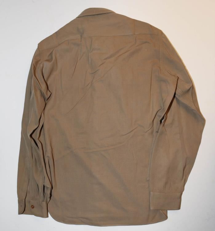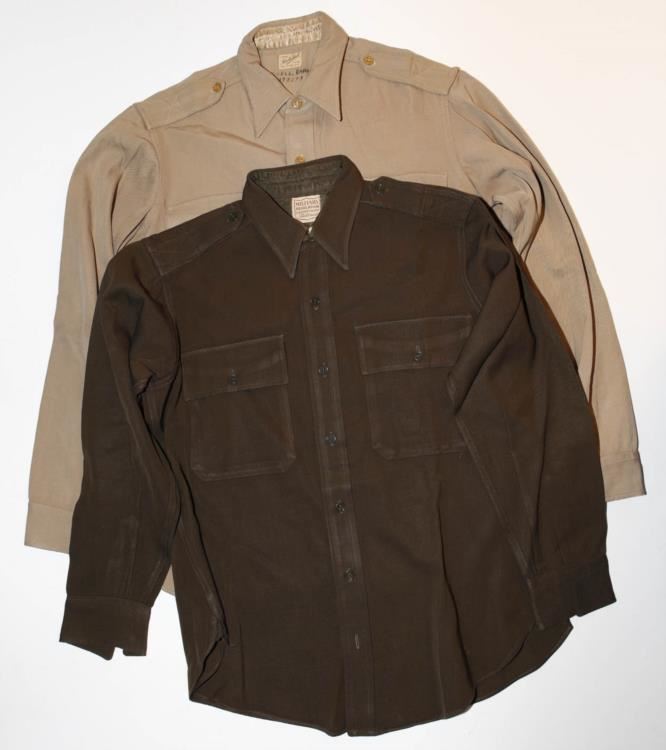 TWO WWII HIGH QUALITY OFFICER'S DRESS SHIRTS-MED SIZE---TAN AND OTHER DARK BROWN