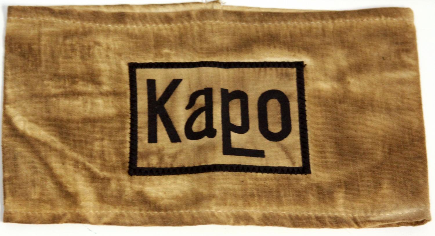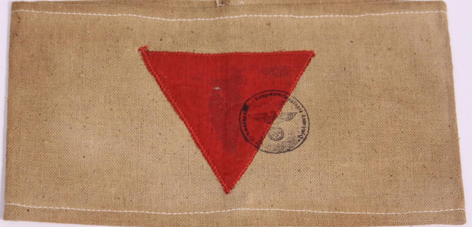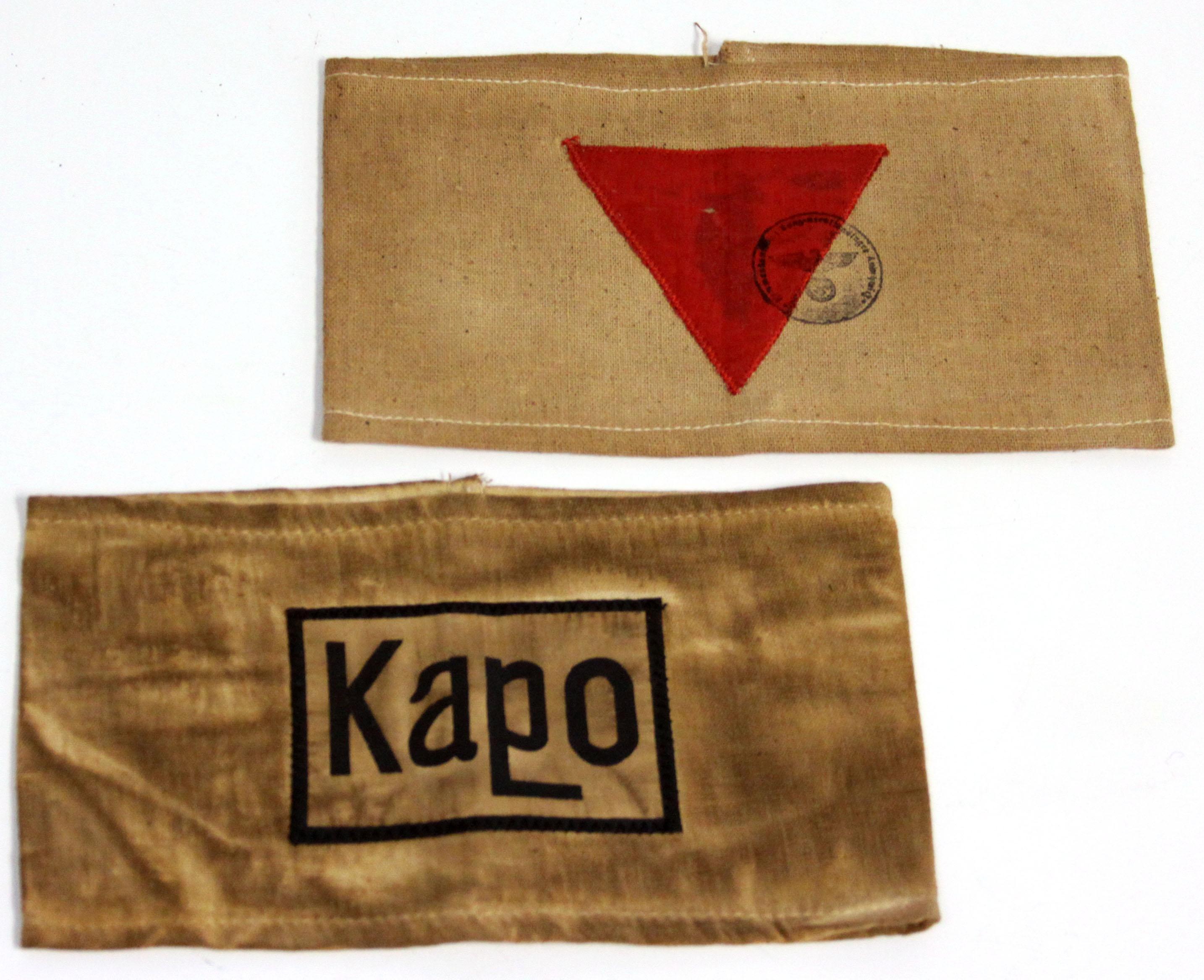 Two concentration camp arm bands from WWII Nazi Germany. One "Kapo" armband, and one political prisoner armband, with red triangle, and stamp.