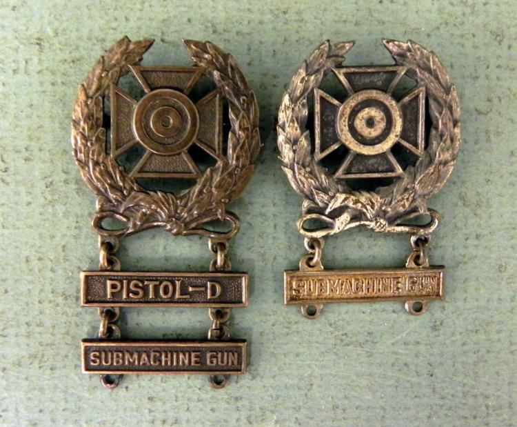 TWO WWII MARKSMAN BADGES-STERLING-2 W/SUBMACHINEGUN BARS AND ONE W/PISTOL-D---2 NICELY PATINATED BADGES