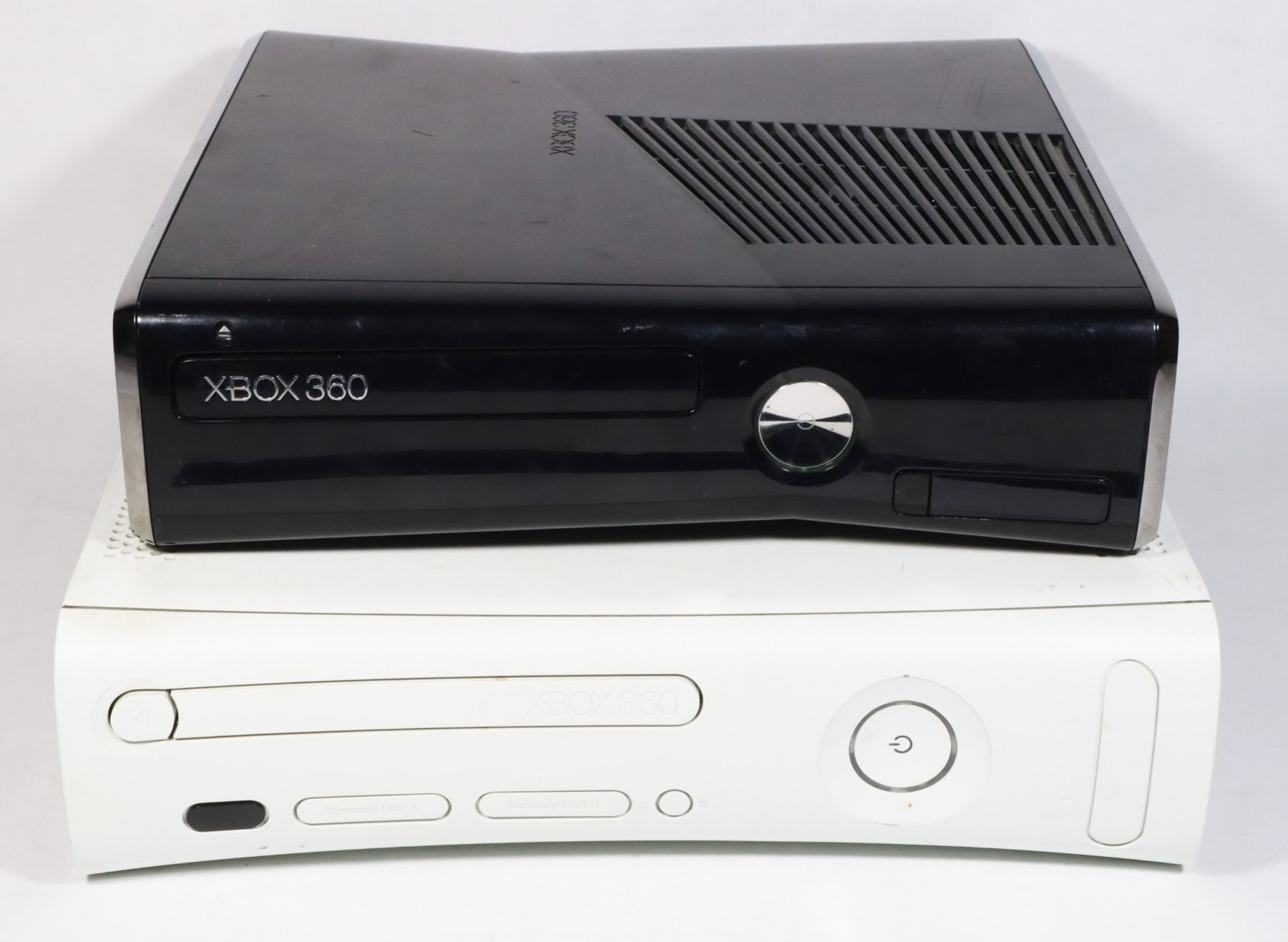 TWO XBOX 360 CONSOLES. BLACK TESTED, WORKS BUT