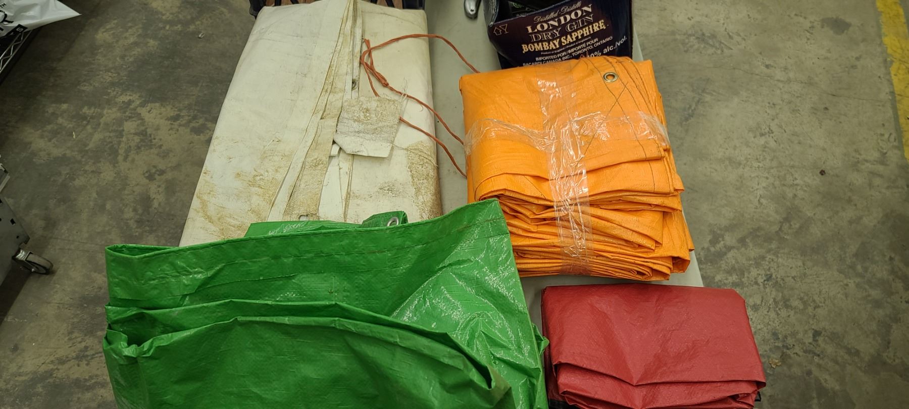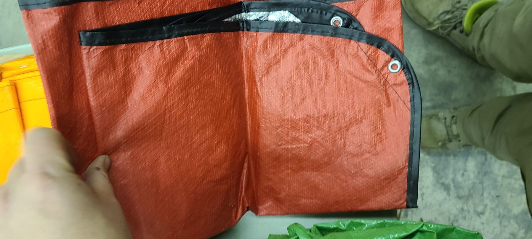 TWOLARGE TARPS, TWO TENT/GROUNDS TARPS AND ONE THERMAL EMERGENCY TARP