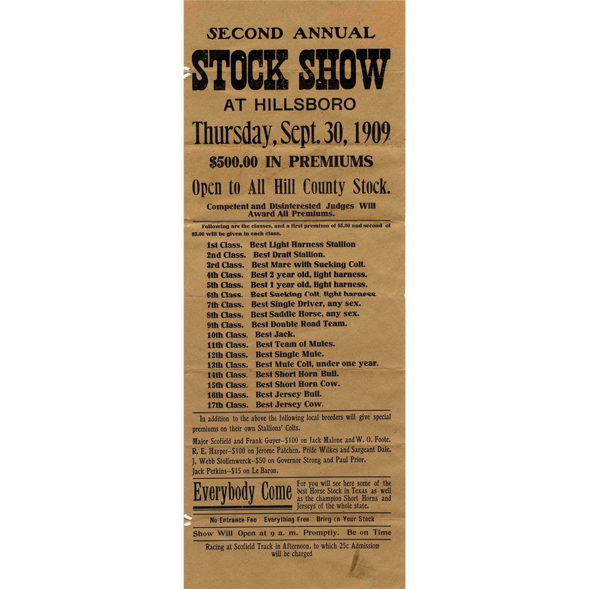 Hillsboro, Texas Broadside to a County Stock Event -- 30 September 1909 -- 5'' x 9'' -- Good