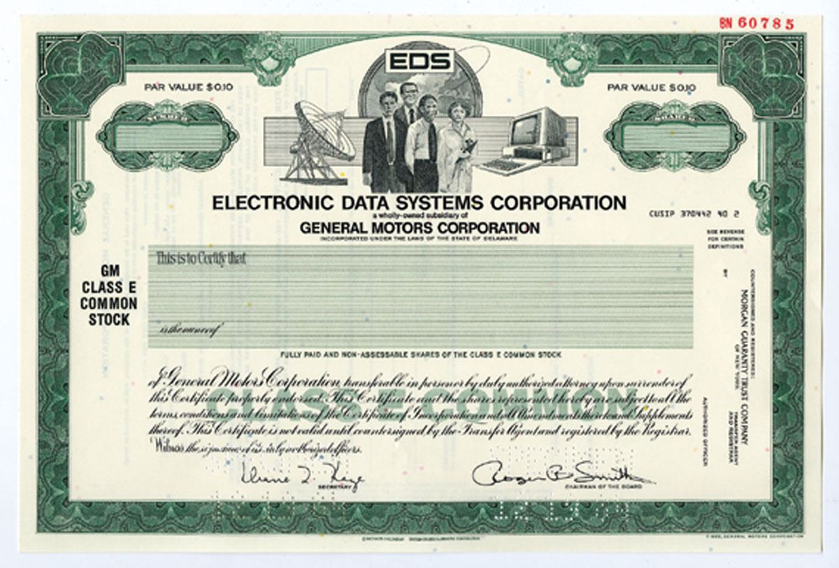 TX. Electronic Data Systems Corp., 1984 100 Shrs Specimen Stock Certificate, XF. Electronic Data Systems (EDS) was an American multinational information technology equipment and services company. Once part of GM.