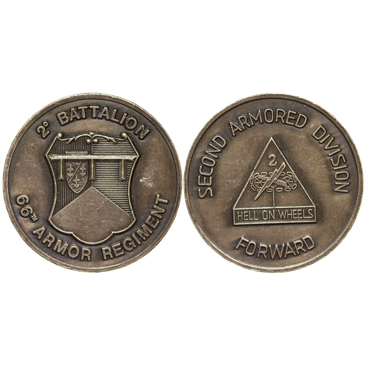 Measures 40mm. Obverse 2nd Battalion 66th Armor Regiment. Reverse, Second Armored Division. Hell on wheels.  - Weber Collection