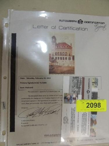 TY COBB AUTOGRAPH ON PICTORIAL POSTAL CARD COA. INCLUDES COA FROM AUTOGRAPH CERTIFICATION EXPERTS # B40683. AS SHOWN. VIEW PICTURE FOR DETAIL. PLEASE BE ADVISED, AND INFORMED REGARDING SIGNATURES OR AUTOGRAPHS THAT WE SELL AT AUCTION: WE ARE NOT AUTHENTICATORS, AND WE DO NOT AUTHENTICATE, OR VALIDATE ANY AUTOGRAPHS OR SIGNATURES THAT WE OFFER AT AUCTION. SOME AUTOGRAPHS OR SIGNATURES MAY COME WITH AN AUTHENTICATION FROM ANY ONE OF LITERALLY HUNDREDS OF AUTHENTICATORS ACROSS THE COUNTRY, AND AROUND THE WORLD. WE DO NOT ENDORSE ANY AUTHENTICATOR, NOR DO WE GUARANTEE THAT ANY AUTOGRAPH OR SIGNATURE IS AUTHENTIC, OR THAT IT WILL PASS AUTHENTICATION BY ANY AUTHENTICATOR. ALL AUTOGRAPHS OR SIGNATURES ARE SOLD