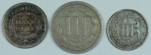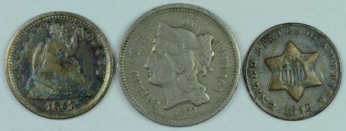 TYPE COINS: 1863 3 CENT NICKEL, FINE, 1857 HALF DIME, VF, 1852 3 CENT SILVER XF+