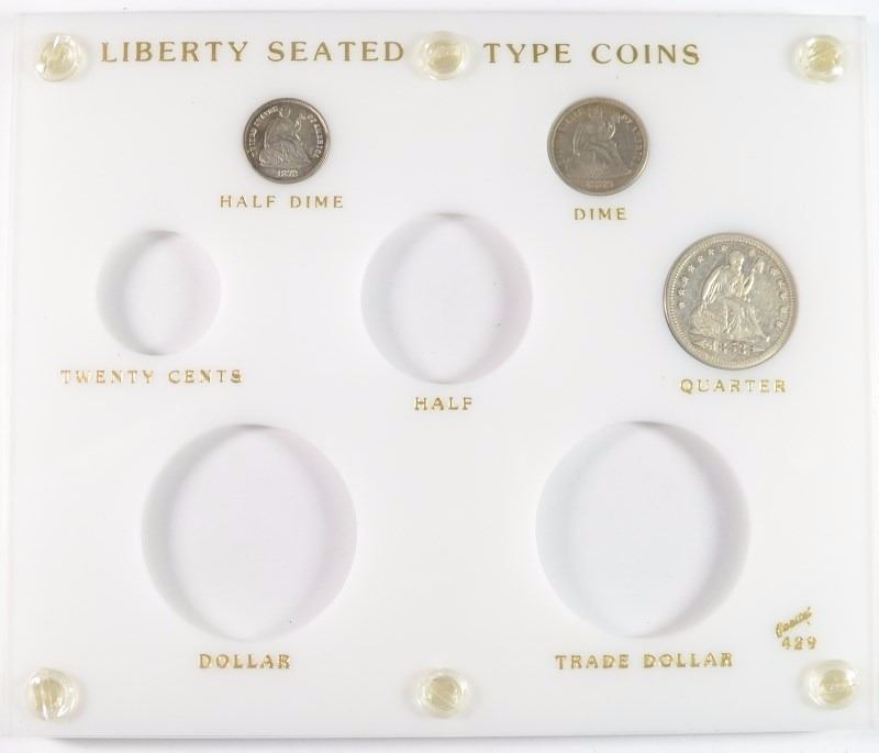 TYPE COINS IN CAPITAL PLASTIC: 1872-S HALF DIME BU, 1889 DIME XF, 1853 ARROWS +