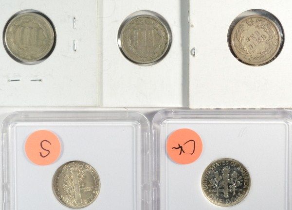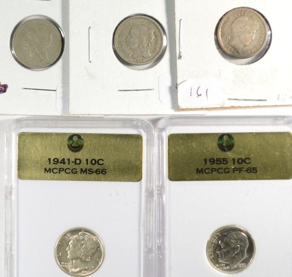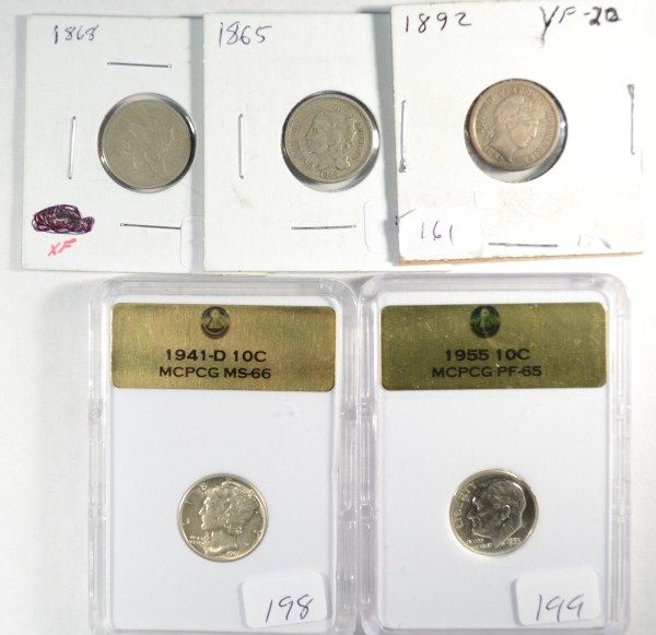 3 CENT NICKELS 1868 XF/AU, 1865 XF, & 1892 BARBER DIME VF/XF, 1941 MERCURY DIME MCPCG MS-66, 1955 ROOSEVELT DIME MCPCG PROOF 65. ESTIMATE $130 - $200
