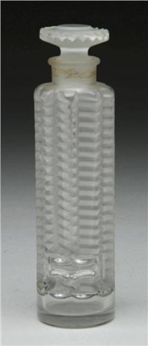 TZIGANE CORDAY SCENT BOTTLE. Wonderful frosted scent bottle was designed by Lalique and produced by Corday for Tzigane. Bottle has frosted, deeply impressed zipper design with matching stopper. Signed on the underside with raised letters "Corday". Bottle comes complete with original violin-shaped box with red satin cover. SIZE: Bottle is 5-1/2" t. Box is 7-1/2" l. CONDITION: Minor wear and soiling to satin cover of box, otherwise very good. 5-62452