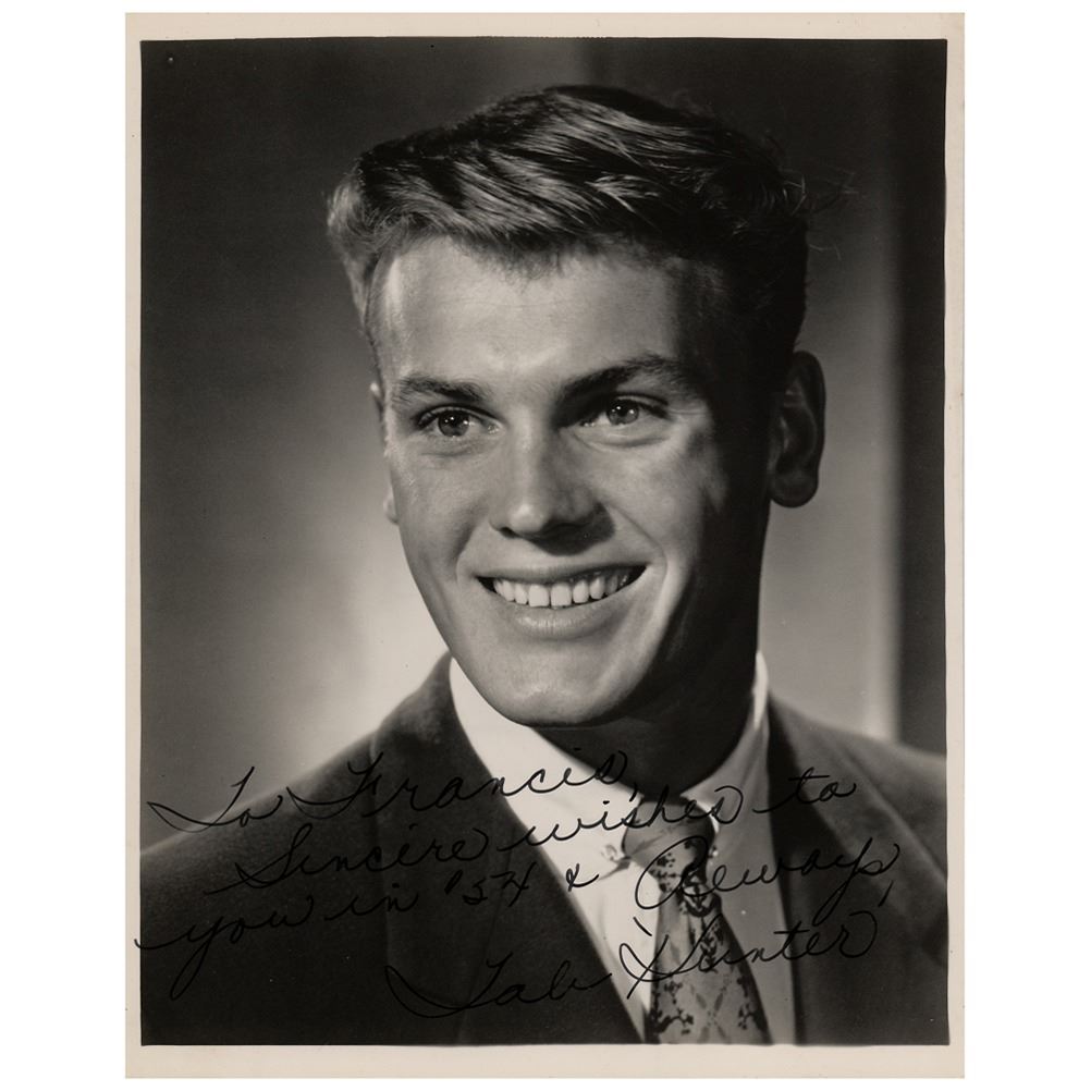 Vintage glossy 7.75 x 10 portrait photo of Hunter as a young stage actor, signed and inscribed in black ink, ‰ÛÏTo Francis, Sincere wishes to you in ‰Û÷54 & always, Tab Hunter.‰Û Reverse bears an American Theatre Art stamps for "Thornton Wilder's 'Our Town.'" In fine condition. Hunter's performances in Our Town led to a contract at Warner Bros.
