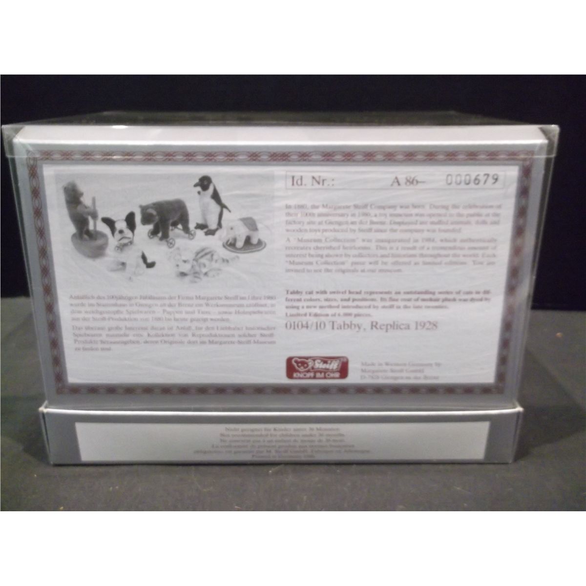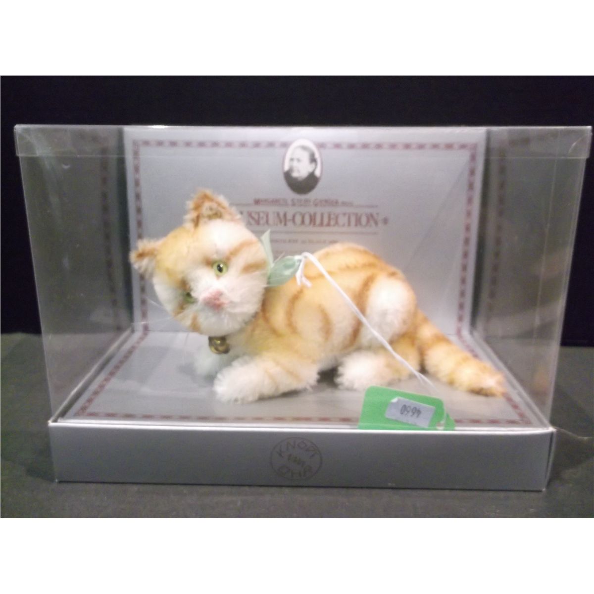 Description: Cat, orange and white striped fur, head jointed, "Museum Collection", replica from 1928, ID # A86-000679 BIE # 0104/10 LTD ED of 6000.Work Title: "Tabby"Company: SteiffCompany Location: West GermanyDimensions: 6"Medium: Mohair plush.Circa: 1986