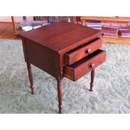 American carved Mahogany and Cherry work table. Circa 1840-1860. Two stepped drawers with turned pendant mounts flanking bottom drawer on wonderful ring-turned legs. Dovetailed drawer construction having pine bottom and sides. Original dark finish sealed and waxed in satin hand-rubbed finish.
