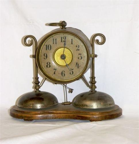 Réveil de table en laiton à 2 cloches et socle en bois, vers 1900