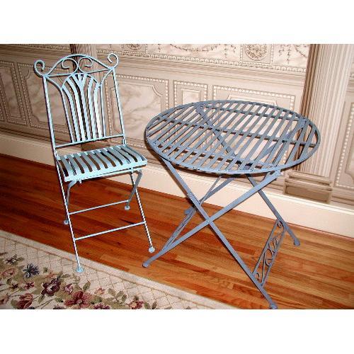 Set of heavy iron folding table and chair comes from the 19th century.5/8" strips of heavy metal comprise the tabletop with decorative cross support on both sides.The chair seat tilts back and is very comfortable. The folding mechanism is unique and very sturdy on both. Painted blue,two shades which co-ordinate beautifully together. Table measures 29L X 28H X 29W. Chair, 37H X 15W X 15L. Excellent condition. Great set used inside or out.