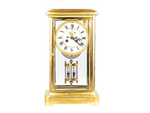 Brass case with cut glass plates. The enamel is slightly damaged on the painted face with Roman numerals. 1/2 striking movement, mercury compensating pendulum. In working condition, 1 year guarantee. French, circa 1900 Size: 40 cm