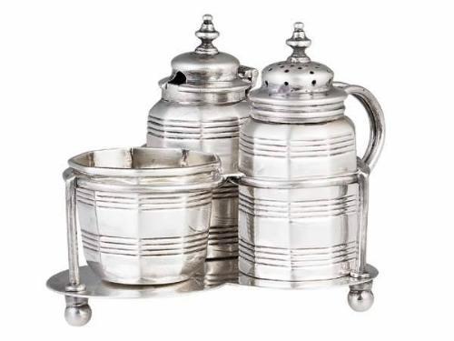 Silver, 296 g, gilt interior. Stand with 3 condiment holders. Marked: London, 1910. Size: 8.5 cm