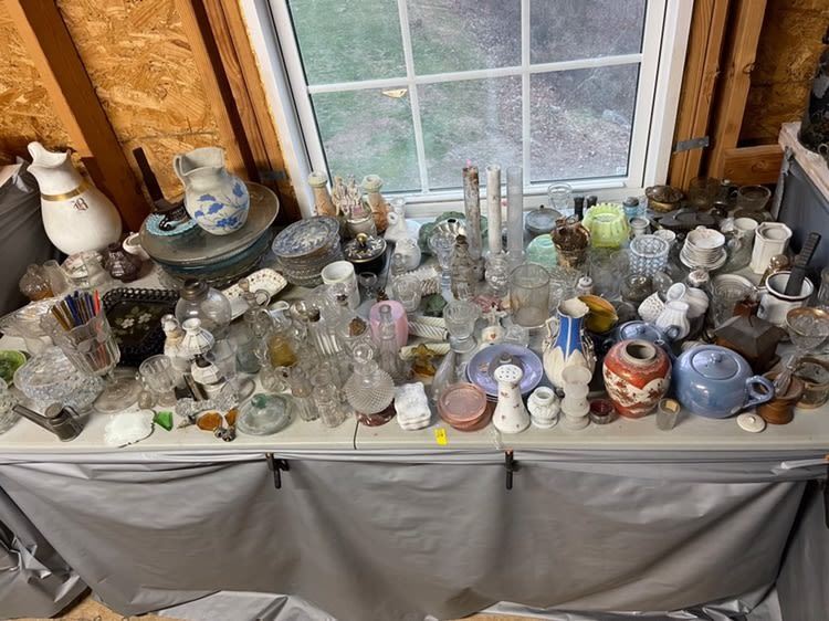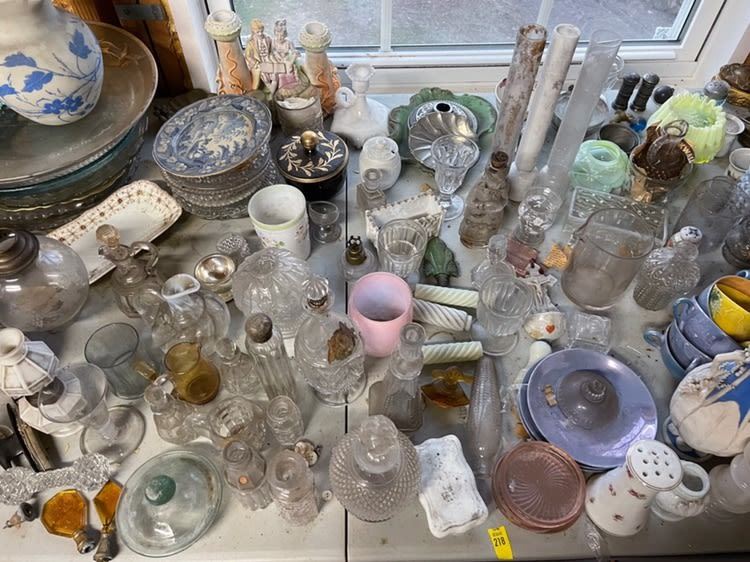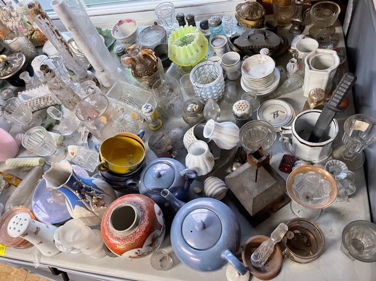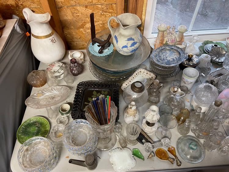 All contents of table including salt cellars, shakers, cruets, porcelain, plates, pitchers, etc. all from the attic and all being sold for one monies!