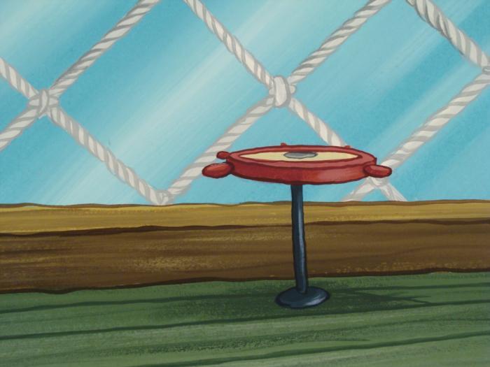 This original hand-painted background from the Nickelodeon TV show SpongeBob Squarepants. The story takes place under the deep blue sea in Bikini Bottom, where SpongeBob resides. SpongeBob, who is a yellow, porous sponge, is your typical happy-go-lucky character, as he is always cheerful and enjoys making people laugh. Patrick Star, SpongeBob's neighbor who is a starfish, is your average children's show idiot, as he boasts knowing nothing and is often getting himself into ridiculous situations. Between the homes of these two lies the home of the miserable Squidward, a squid, who is known for being grouchy and playing tricks on SpongeBob and Patrick. Both SpongeBob and Squidward work at the Krusty Krab, a fast food business run by the greedy money-loving Mr. Krabs, a crab, the arch rival of the evil, possibly misunderstood, Plankton. Another neighbor, Sandy Cheeks, an athletic squirrel who normally wears an astronaut's space suit, was introduced in "Tea at the Treedome." She spends most of her time inventing and experimenting. Inside the Krusty Krab ResturantOriginal Production Background Overall Size of Background: 10 1/2" x 13 3/4" Very good conditionOriginal Production Backgrounds are used in the making of the final version of animated productions. The background establishes the location and the overall good mood of the scenee. Typically, a background layout artist creates a drawing to establish the content of the scene, placement of characters, perspective and camera angle. Based on this drawing, the background artist creates a preliminary painting to confirm all of the scenes details, then the final production background which is used in the filming of the scene. When these backgrounds are individually photographed behind the progression of production cels, and projected at a rapid succession, the images in the foreground appear to move, creating an animated scene. The background is ready to be matted and framed. It is a colored background with the animator's notations at the bottom.