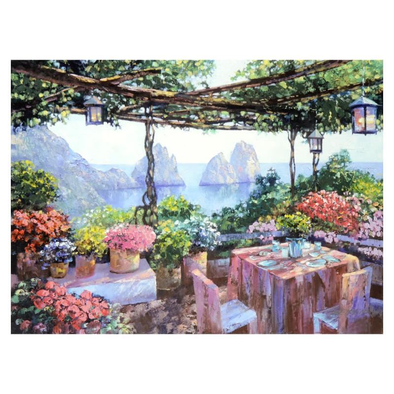 "Table For Two, Capri" is a limited edition giclee on canvas by Howard Behrens (1933-2014), numbered and bearing the authorized signature of the artist. This piece is from Behrens' Legacy Edition. Includes Certificate of Authenticity. Measures approx. 32" x 24" (image).