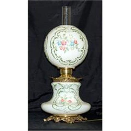 A great molded glass table lamp with a 10 inch diameter ball. The protruding molded sections are hand painted in green, pink and blue flowers and scrolling. It has been electrified and the ball shade and the base light. A beautiful mint condition lamp.