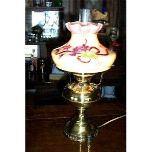 A Rayo Junior brass table lamp with a hand painted shade. It is patent dated 12-31-1895. It has been electrified but I still have the wick adjustment piece to return it to original condition.
