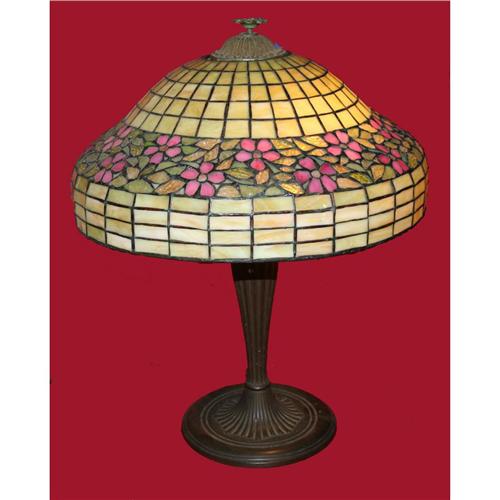 Table Lamp.  An unattributed table lamp with leaded slag glass shade of pink, five-petal flowers on a green geometric ground over a simple metal base with two sockets, 1900-1940.  The base measures 21" to top of finial x 8 ½" D.  The shade measures 7"H x 15 7/8" D.