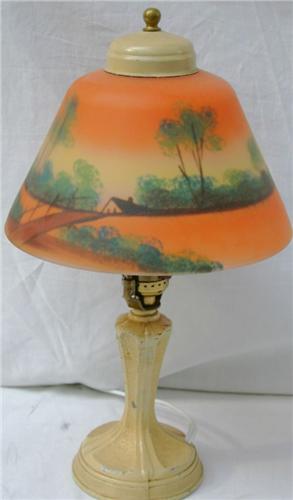 Small table lamp with reverse painted shade of country scene and metal base. Shade measures approximately 8" in diameter. Lamp is approximately 15" H.