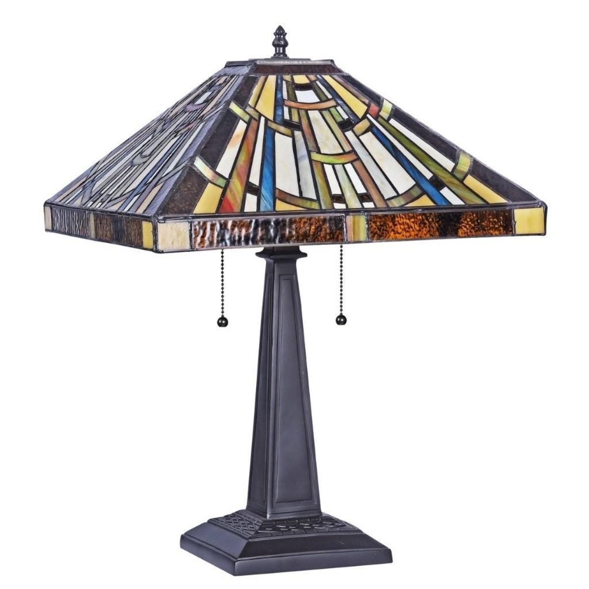 FALKNER Tiffany-style Victorian 2 Light Table Lamp 16" Wide FALKNER. a stained glass table lamp adds a touch of drama to your home, along with a warm glow. The traditional look makes it a perfect piece for your study room. Glass Type Tiffany-glass Net Weight (lbs)10.36 Overall Length (in)16.00 Overall Width (in)16.00 Overall Height (in)22.44 Shade Width (in)16.00 Shade Height (in)7.28 Base Width (in)6.97 Base Height (in)9.65 Base/Stem Materials Resin; Metal Electric Wire Length (in)72 Threaded Pipe/Finial Length (in)5.43 Threaded Pipe/Finial Material Metal Light Bulb Types(2) 100 Watt max E26 Type A Bulb (not included) Switch Type Pull chain Est. Glass Cuts 304 Light Direction Downlight Specific Uses Indoor Finish Blackish Bronze Overall Materials Glass, resin, metal & electrical components Glass Thickness (in)0.12 Shade Shape Square