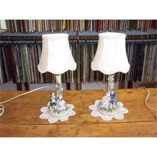 Pair of German Porcelain Table Lamps, circa 1890. Courting couple and matching musical duet in the Meissen Style. German marked #124 and 122. Small Silk replacement shades.