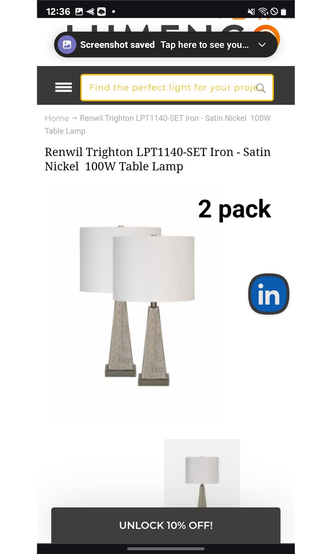 Set of two Renwil Trighton lamps with modern iron and satin nickel design, 100W, new.