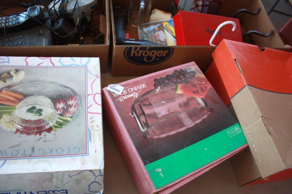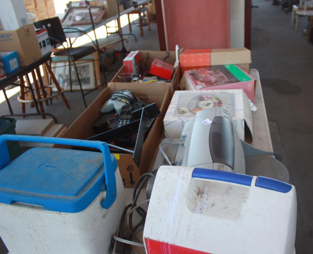 Table Lot Of Misc. Cooler, Printer, Serving Bowl,