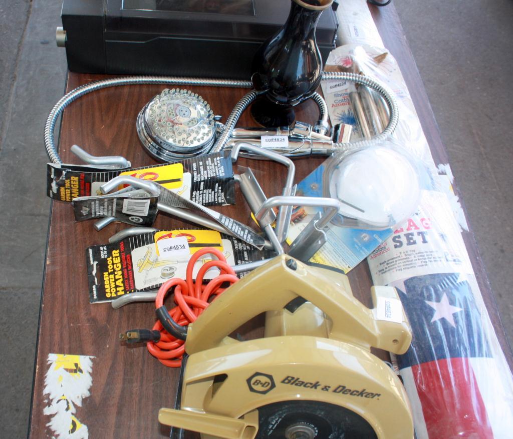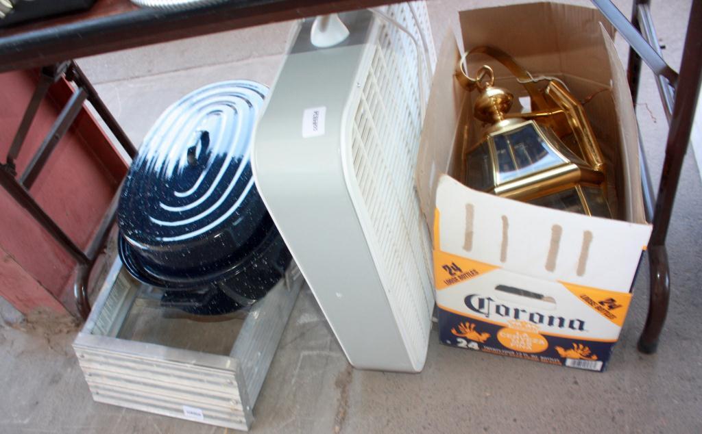 Table Lot Of Misc. Fan, Shower Head, Pot,