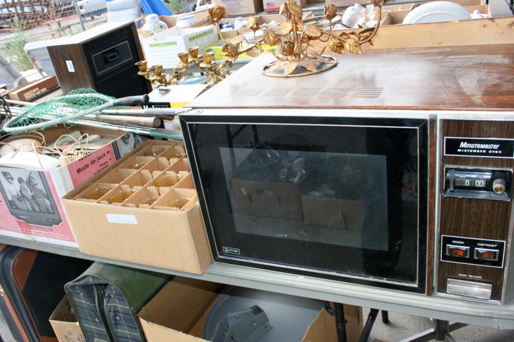 Table Lot Of Misc. Microwave, Jars, Glasses,