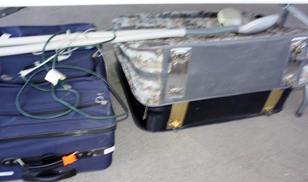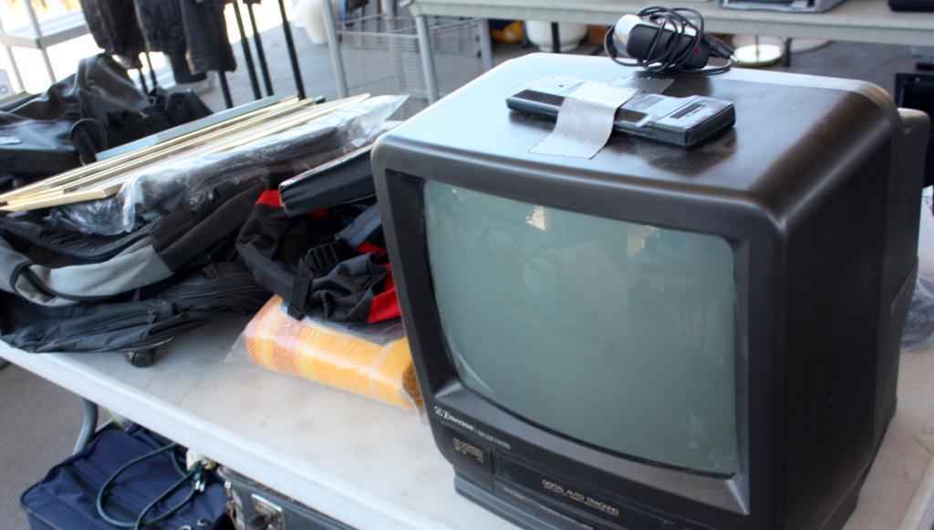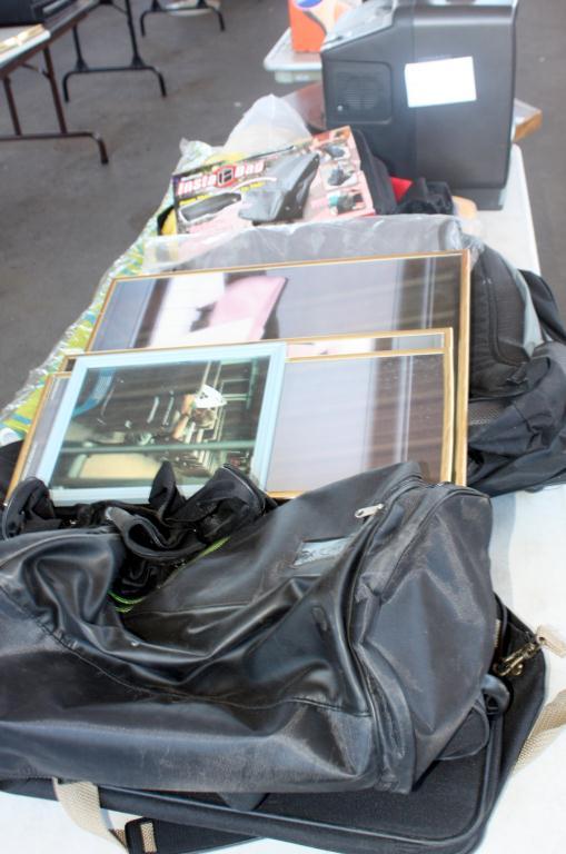 Table Lot Of Misc. T.V., Frames, Bags Suitcases,