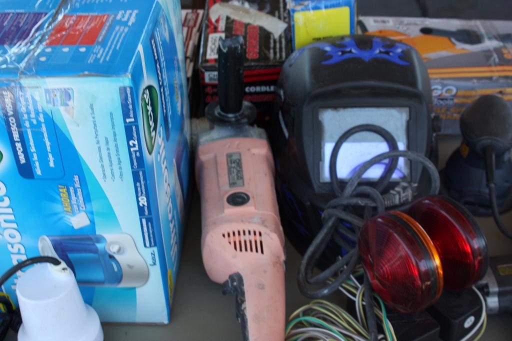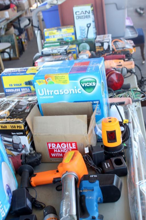 Table Lot Of Misc. Tools, Can Crusher, Humidifier,