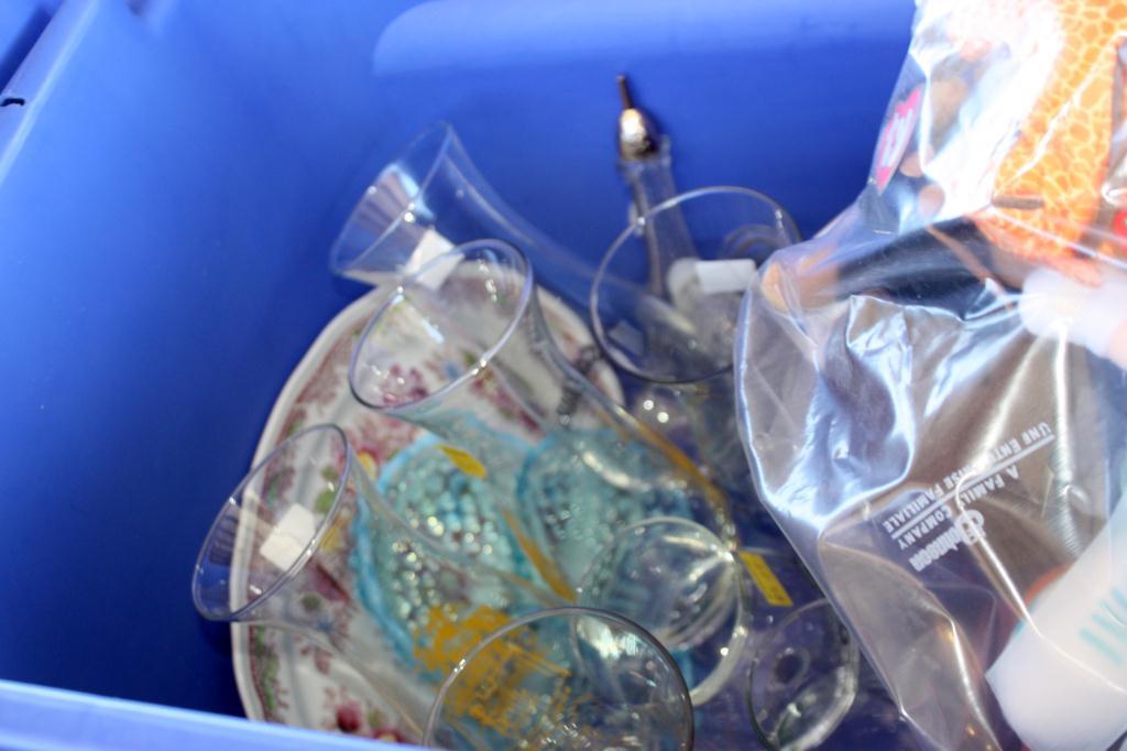 Table Lot Of Misc. Toys, Tall Drinking Glasses,