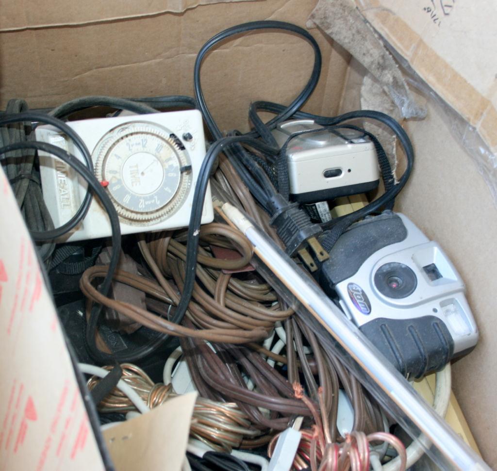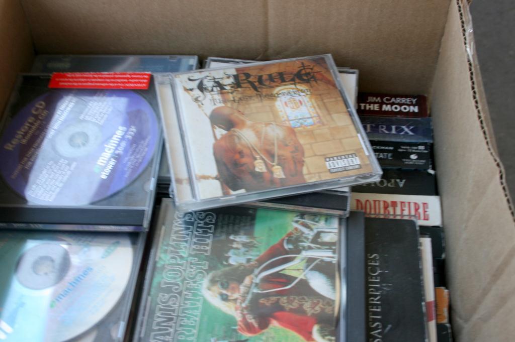 Table Lot of Misc. CD's, Lamp, Cameras, Toys,
