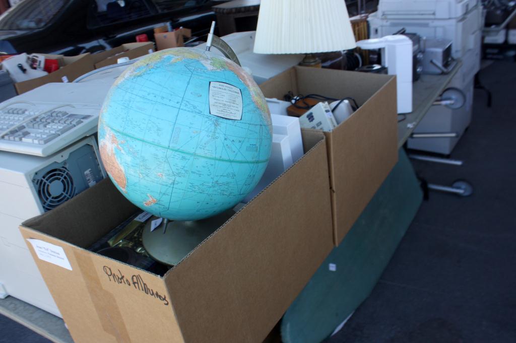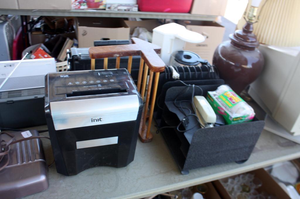 Table Lot of Misc. Cups, Walker, Lamps, Globe,
