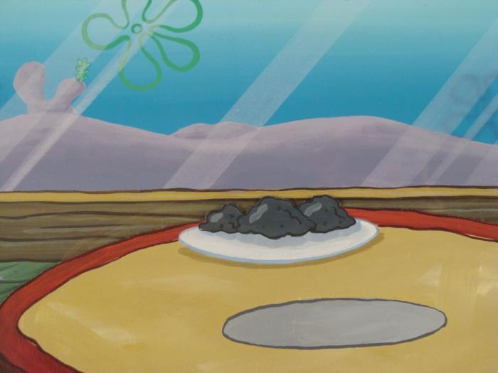 This original hand-painted background and animation cel are from the Nickelodeon TV show SpongeBob Squarepants. The story takes place under the deep blue sea in Bikini Bottom, where SpongeBob resides. SpongeBob, who is a yellow, porous sponge, is your typical happy-go-lucky character, as he is always cheerful and enjoys making people laugh. Patrick Star, SpongeBob's neighbor who is a starfish, is your average children's show idiot, as he boasts knowing nothing and is often getting himself into ridiculous situations. Between the homes of these two lies the home of the miserable Squidward, a squid, who is known for being grouchy and playing tricks on SpongeBob and Patrick. Both SpongeBob and Squidward work at the Krusty Krab, a fast food business run by the greedy money-loving Mr. Krabs, a crab, the arch rival of the evil, possibly misunderstood, Plankton. Another neighbor, Sandy Cheeks, an athletic squirrel who normally wears an astronaut's space suit, was introduced in "Tea at the Treedome." She spends most of her time inventing and experimenting. It seems to a table in the Krusty Krab.Original Production Background and Animated Cel Overall Size of Background: 10 1/2" x 13 3/4" Overall Size of the Cel: 10 1/2" x 12 1/2" Very good condition; it has been stored This is an original hand-painted cel set-up used in the production of an episode of "SpongeBob SquarePants." Each one-of-a-kind set-up represents a slight change in position of the characters. When individually photographed and projected in rapid succession, the images appear to move.