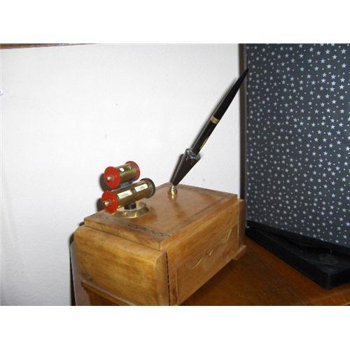 I have this wonderful desk/table top cigarette box for your viewing. This box is made of ceder. There is one row inside for cigarettes, with a large space in the bottom. The door in the front bottom pulls out with a tray for cigarettes. On the top of the box is a black ink pen and a daily calendar. This piece is in very good condition. The area behind the draw has a little color difference, this area has more varnish due to the draw being closed through the years. When the draw is closed, the patina matches overall. All original. See photos. Take a glance at my other items. Thank you for viewing.