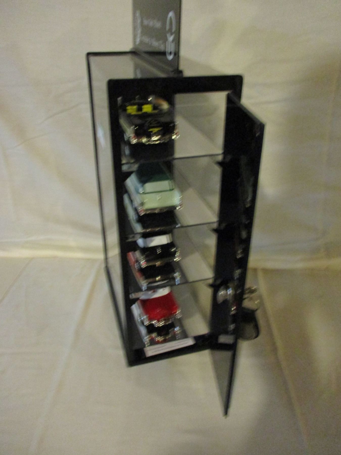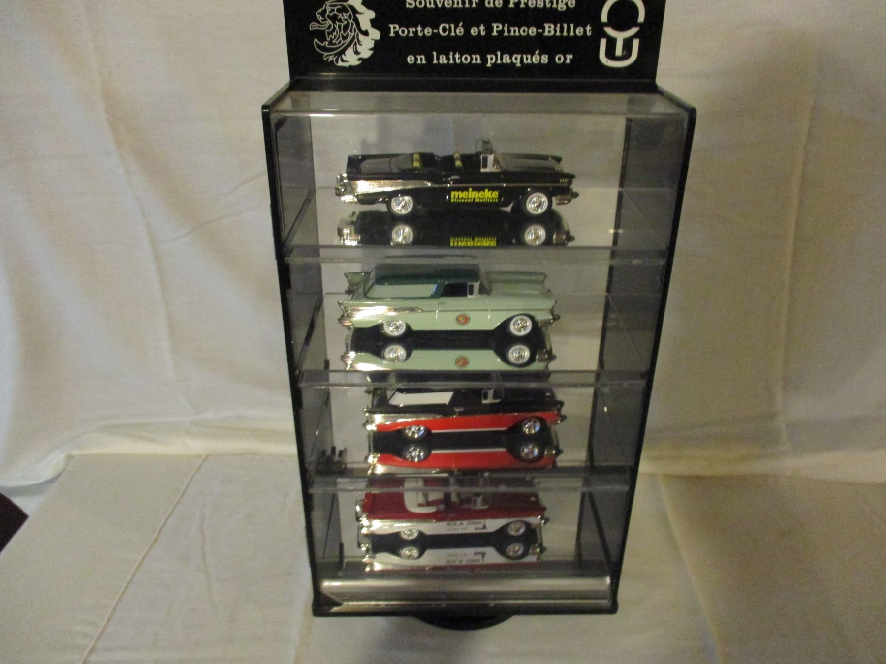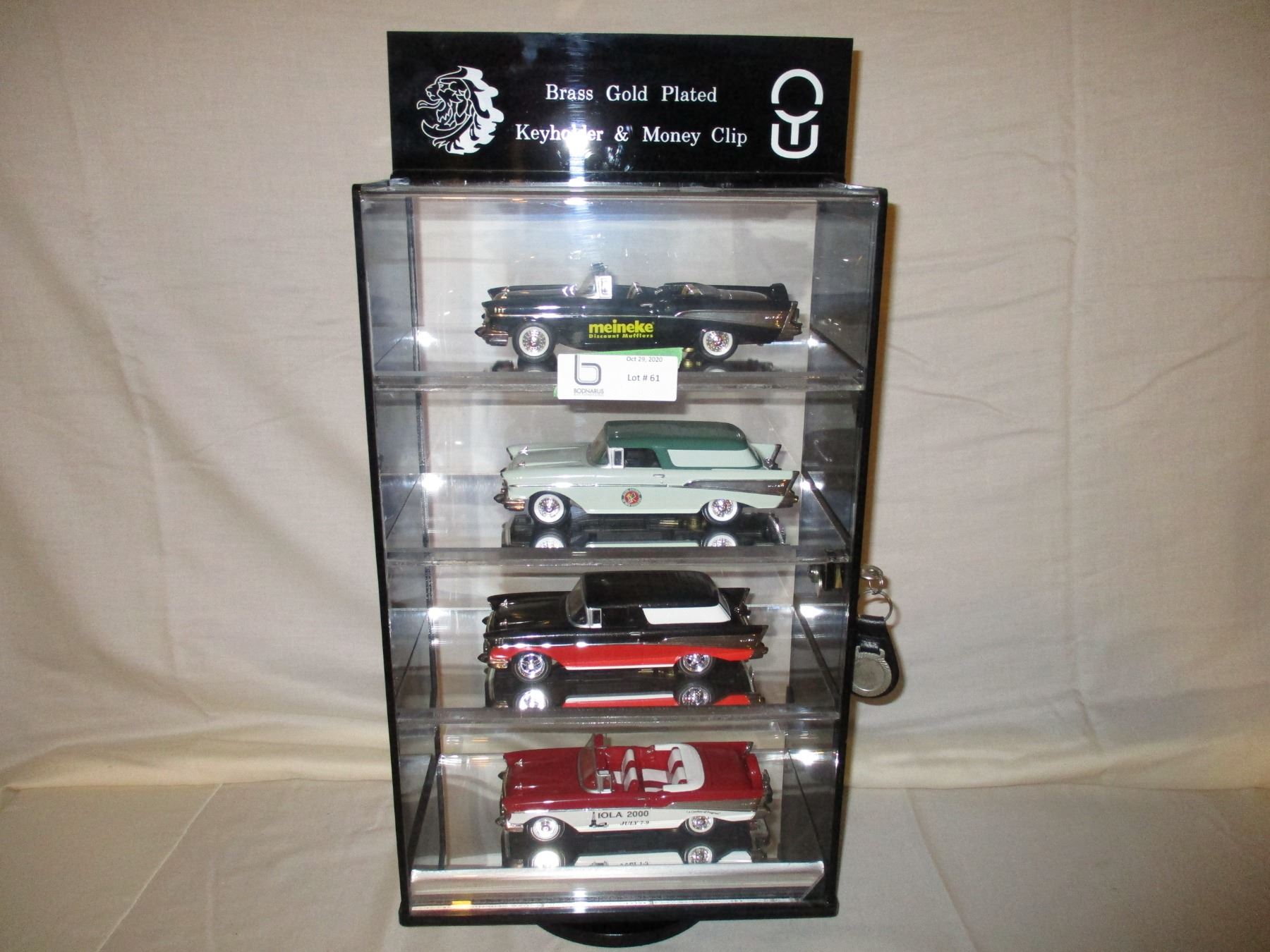 Table Top Plastic Display Case With Lock and Key 6.5" by 11" by 19" and 4 1950s Chevrolet Models