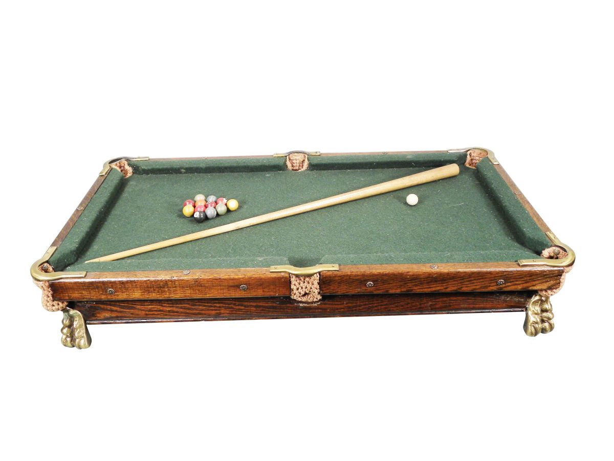 Table Top Pool table. Oak with brass feet not original to table. New felt and pockets. Missing two balls, good condition. 36 X 6 1/2 X 20 inches.