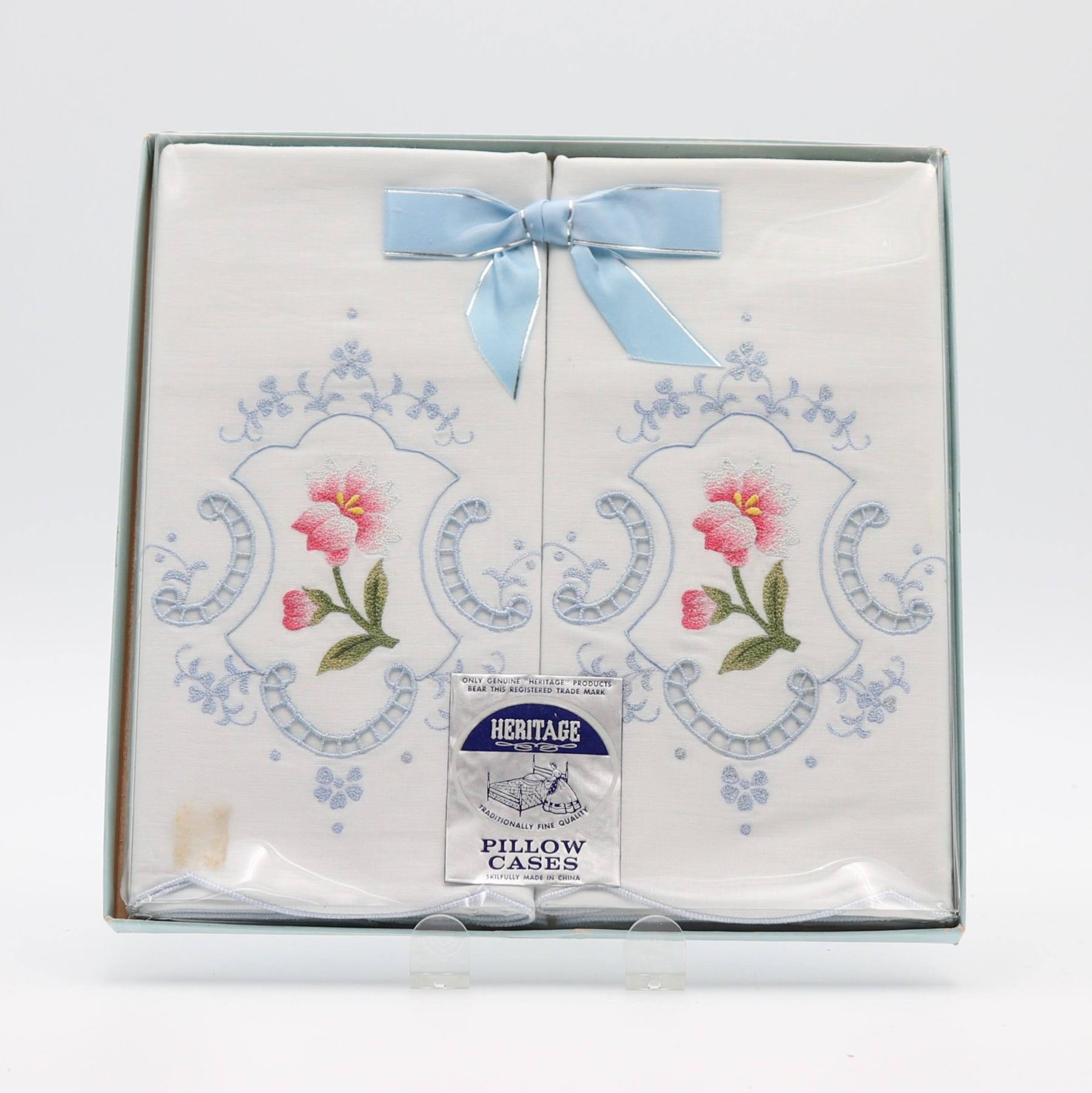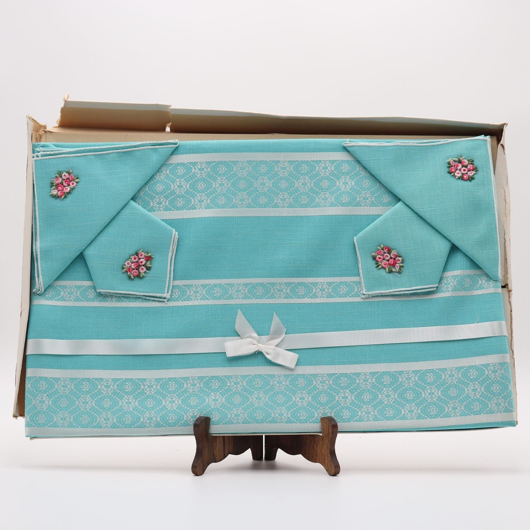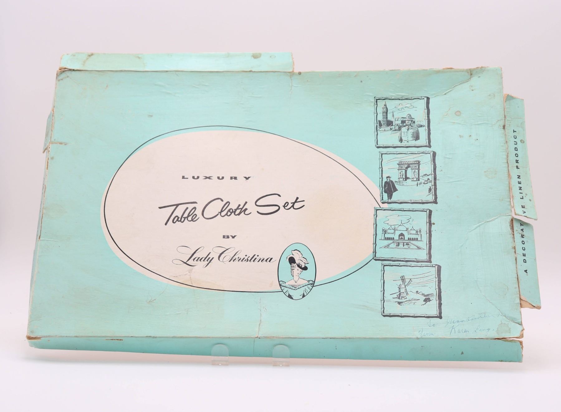 Footed dessert plater with cake knife 'Toscony' by Westbury Japan; Vintage table cloth set by Lady Christina; pillow cases by Heritage