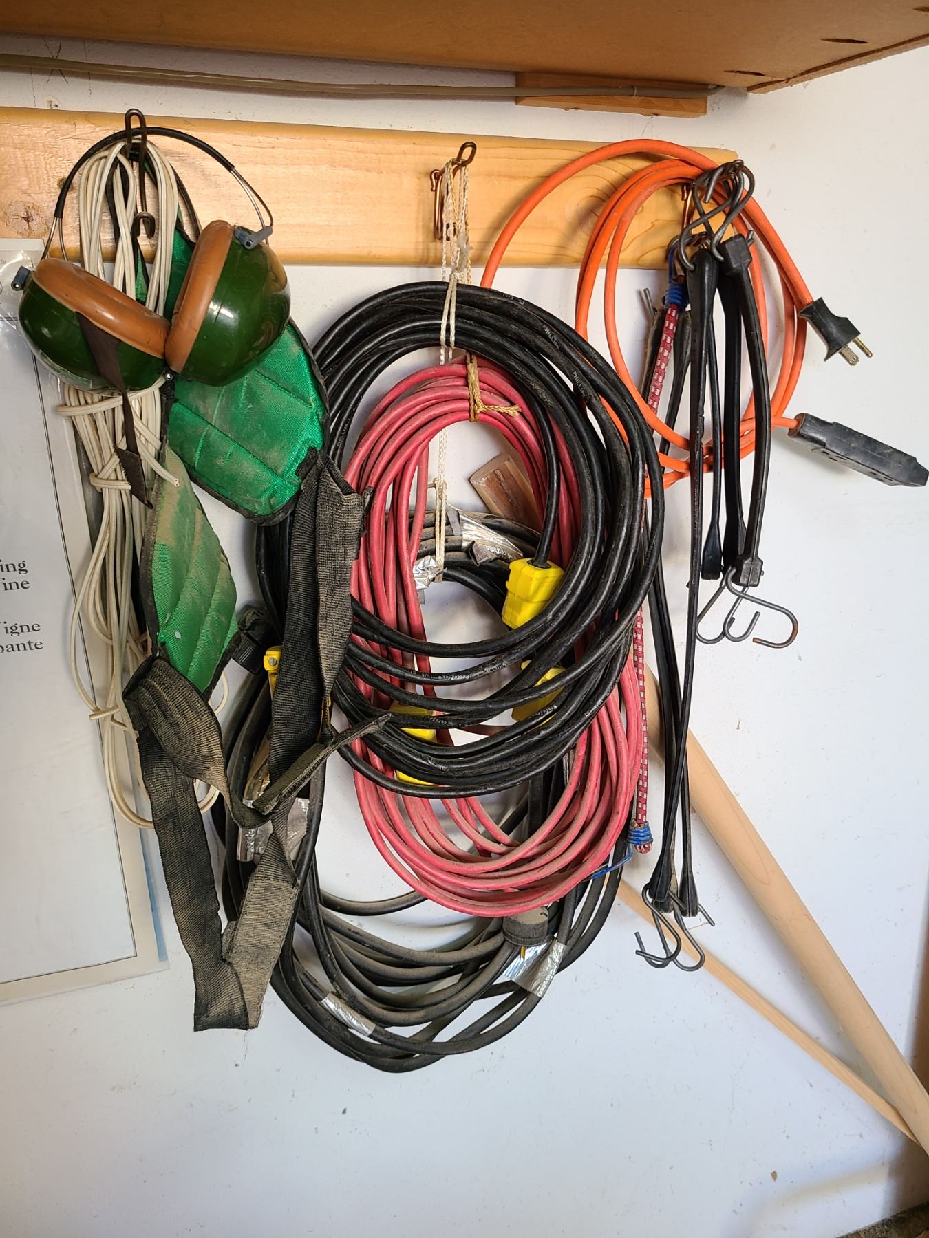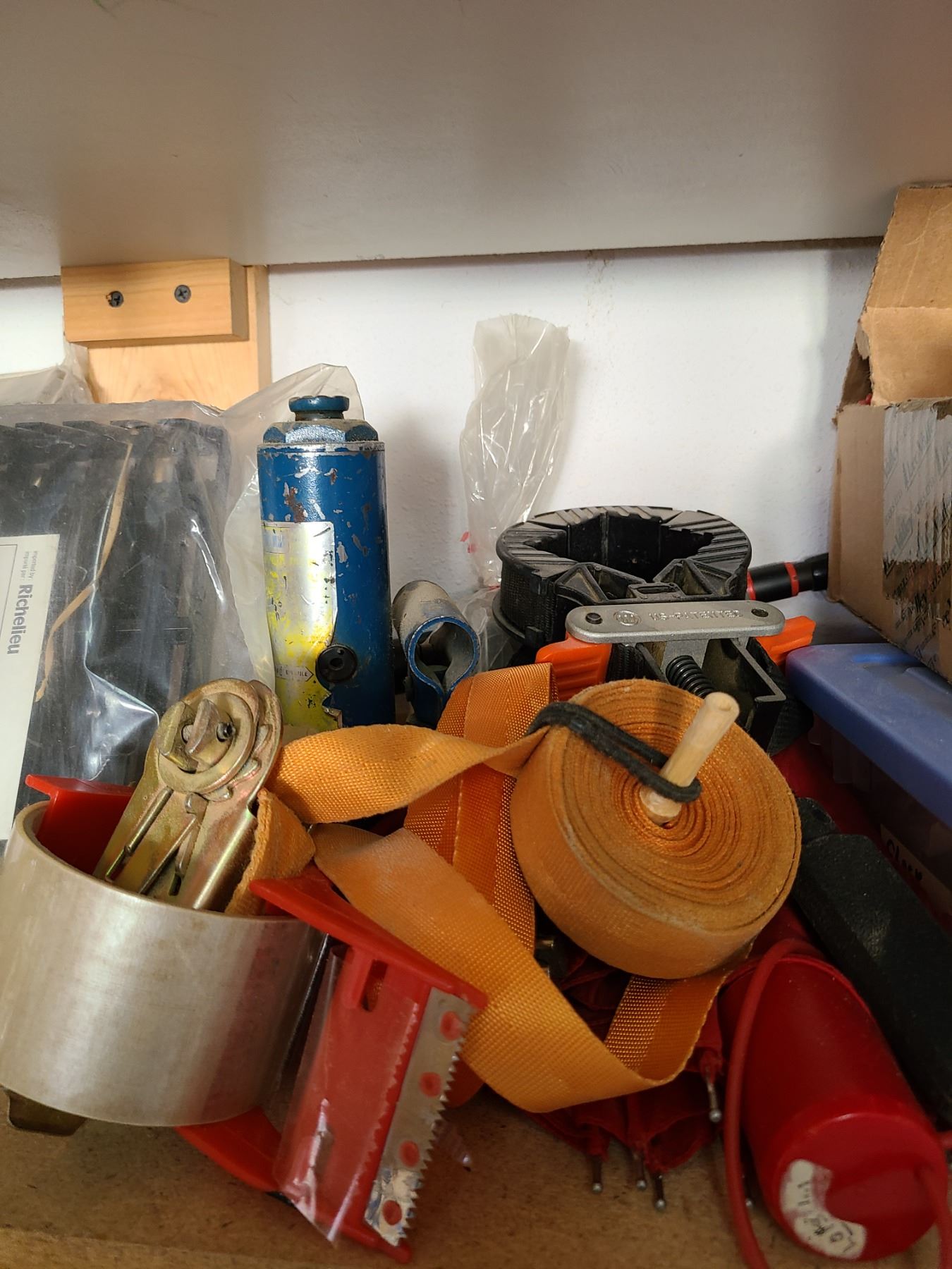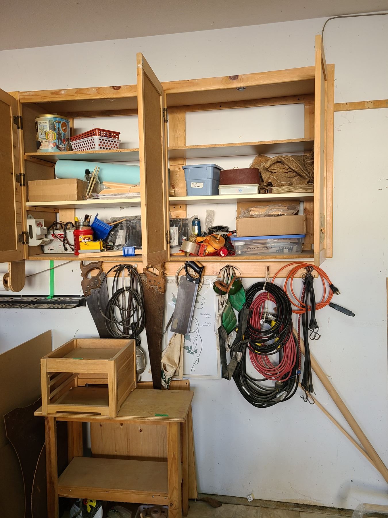 Assortment of hand tools, cords, small table, drawer, and contents of 2 cupboards above. Bring boxes. Pickup 9 am.